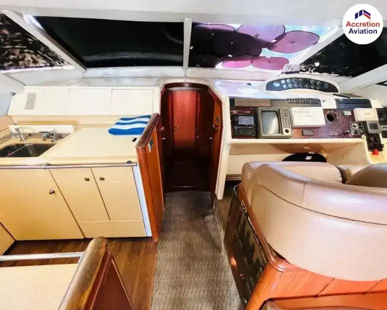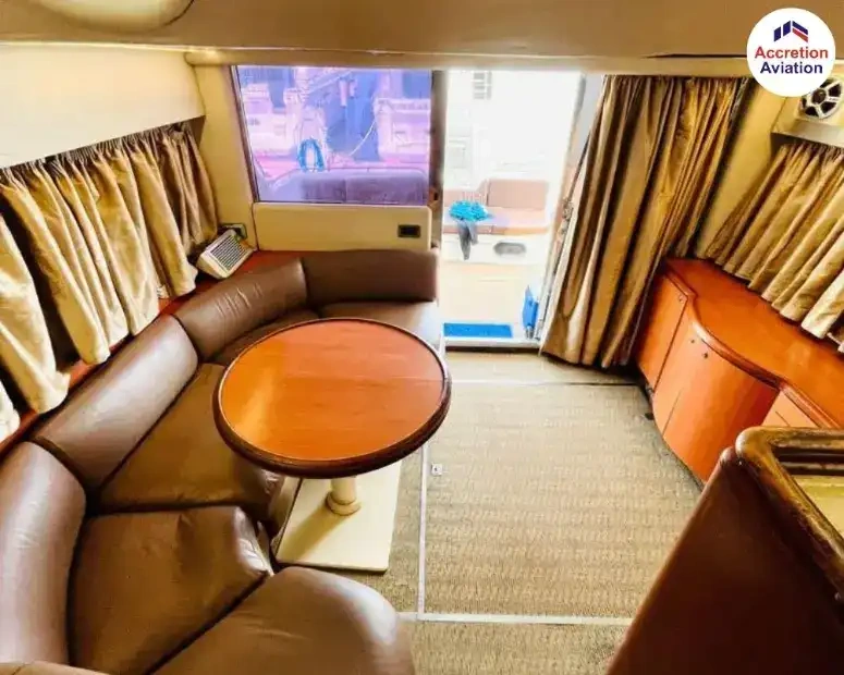 The Blue Diamond features a spacious sun deck, an aft deck, and a flybridge that offers elevated panoramic views of the sea and the coastline. The indoor lounge has large windows all around, letting in natural light and giving guests a wide view even from inside. The yacht is air-conditioned and has a washroom on board. The cockpit area has comfortable seating with a collapsible teak table for outdoor dining. A sound system is available for music throughout the ride. Complimentary amenities include mineral water, chilled soft drinks, and ice.