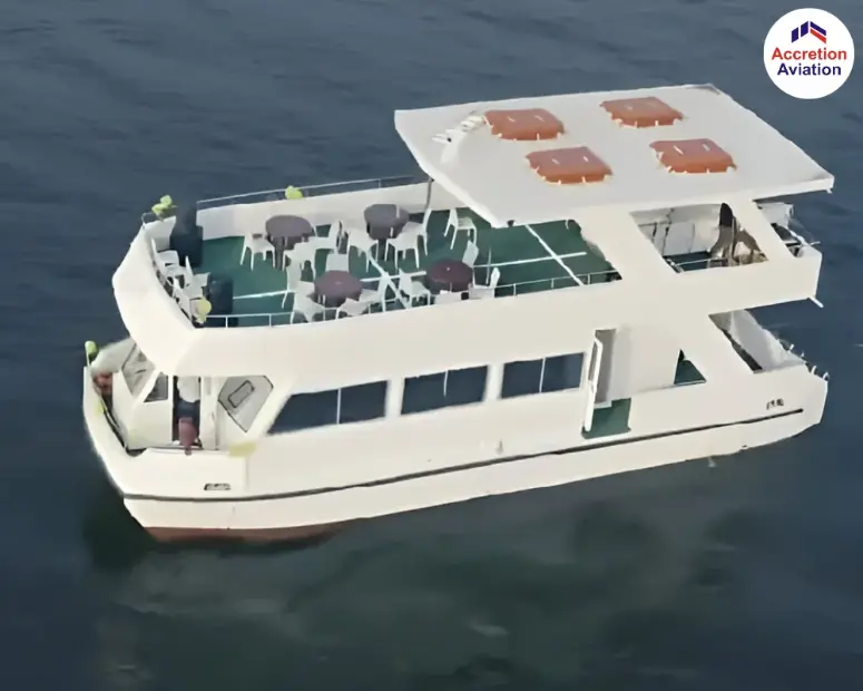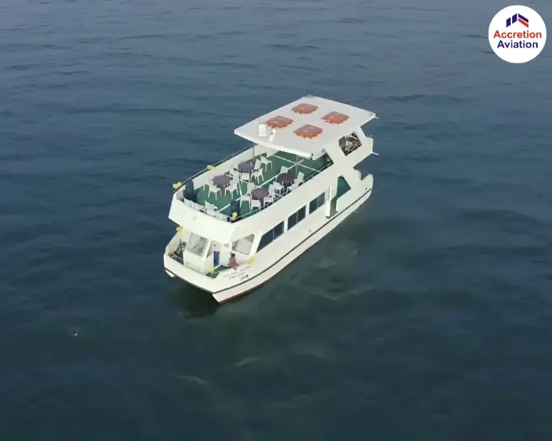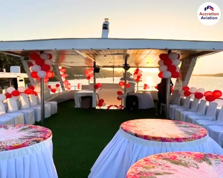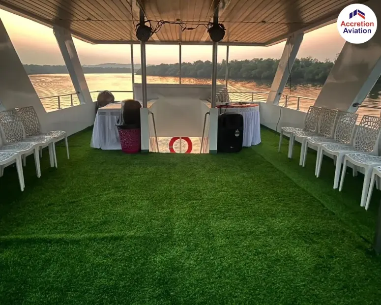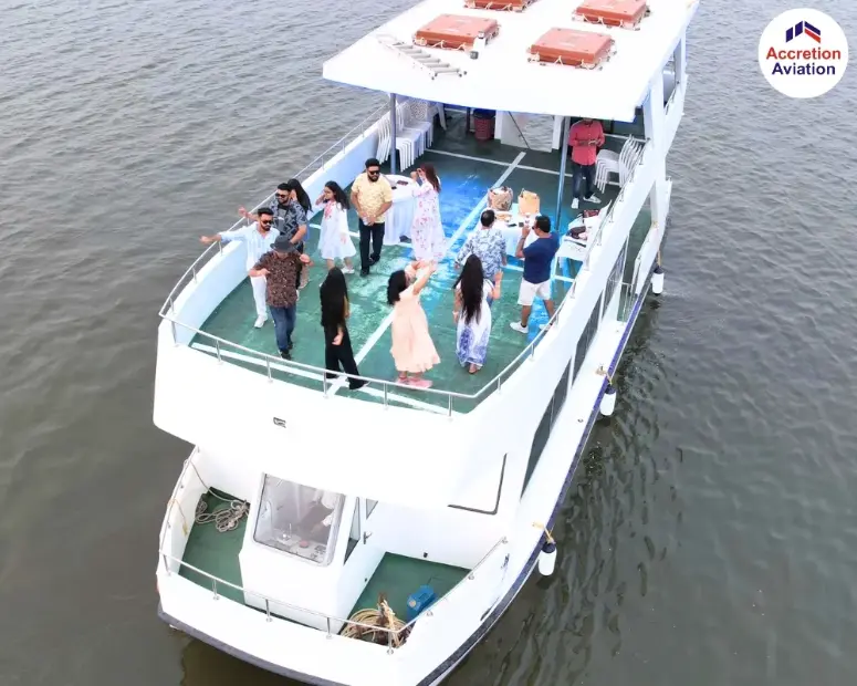 The Lovely Sharon yacht on rent in Goa would initiate from near Panjim, Goa through the city's breathtaking views while navigating past a bird sanctuary. Start by cruising on a luxury yacht in Goa for 30 minutes to view elegant bird species on an exclusive Goa yacht. You will have a thrill spotting crocodiles or dolphins while enjoying it with your friends and family. The yacht is then anchored for 1 hour, where you can enjoy food, photo shoots, and a DJ party. The yacht will travel back to its jetty in thirty minutes. This completes the 2-hour private Lovely Sharon yacht trip of 1 hour sailing and 1 hour anchoring.